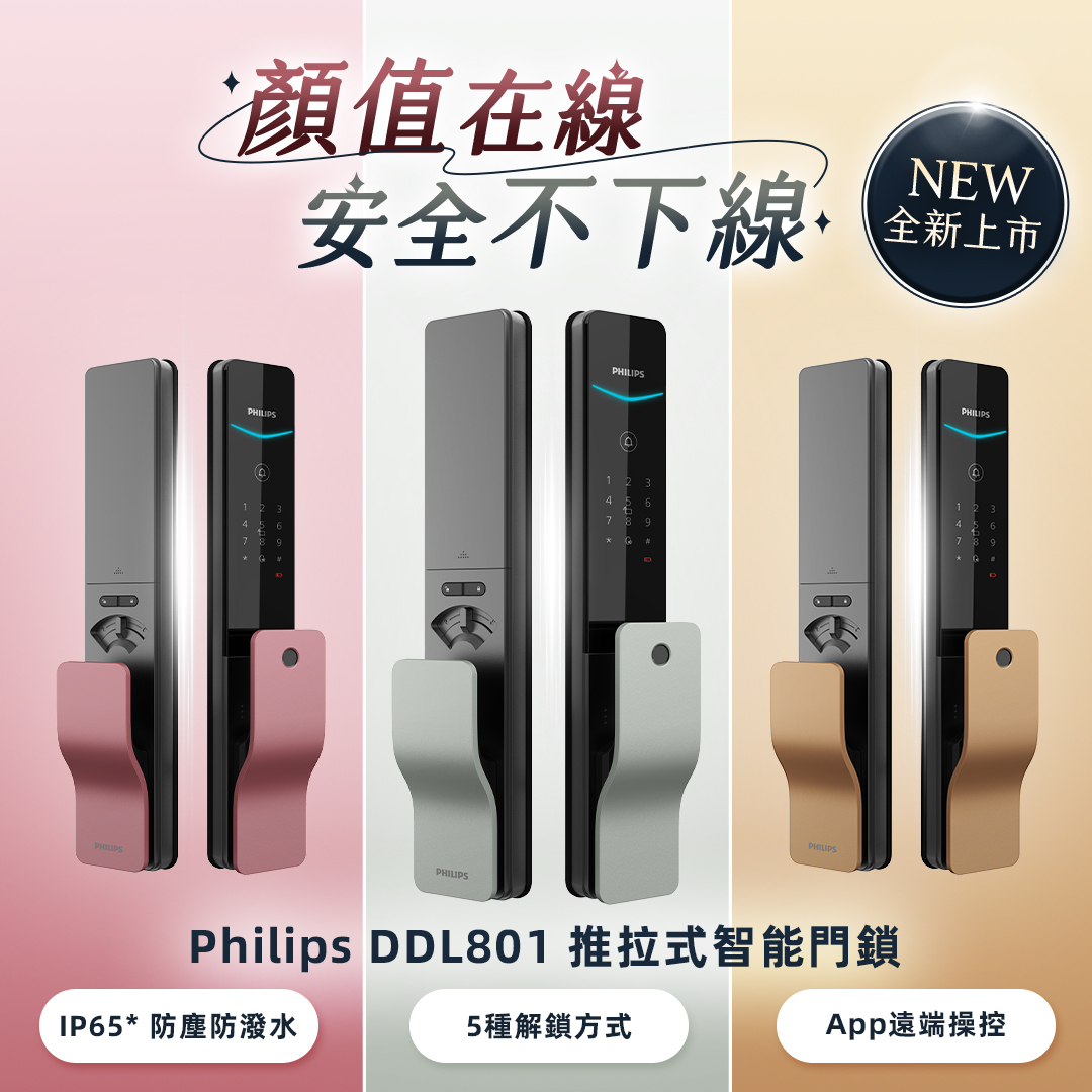 Philips DDL801 智能電子鎖甫上市即勇奪 2025 德國 iF 與 Red Dot 紅點設計獎,以俐落推拉外型與簡約現代美學,展現全球家居科技品牌的設計實力。DDL801 不僅強調設計,更首創 可自行更換的多色手把設計,打造專屬居家入口風格;同時具備 IP65 防塵防潑水等級,能有效防止灰塵與雨水侵入,專為台灣潮濕多變的環境而生,將安全與美感合而為一。