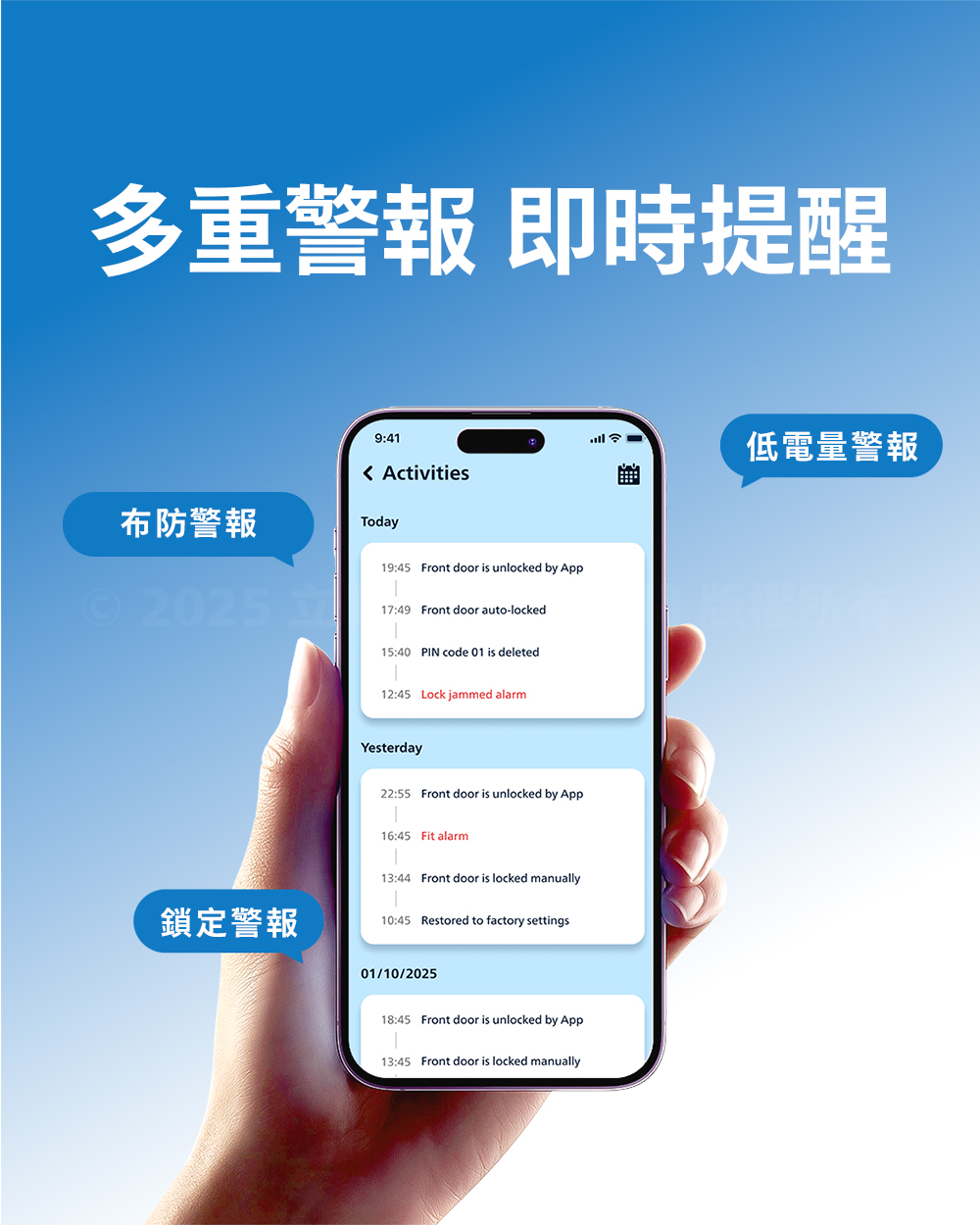 即時遠端智控,安全盡在您手中!飛利浦DDL801-5HBS透過連接網路,並綁定手機App,讓您隨時隨地實現遠端一鍵解鎖,輕鬆查看門鎖記錄和警告訊息,讓您的家門動態完全掌握在您的手中!