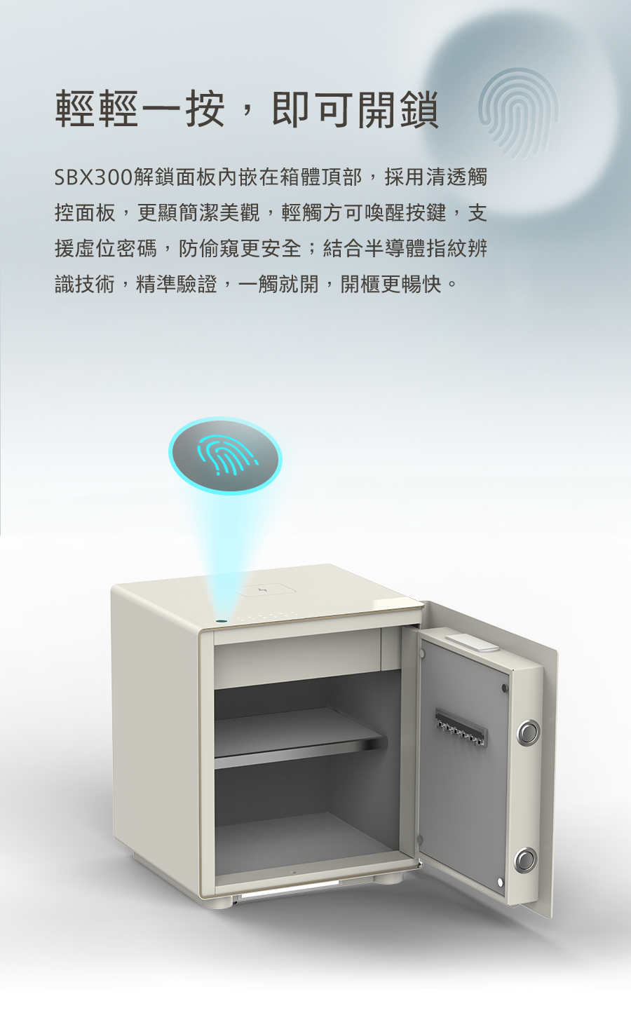 SBX300以簡約時尚設計,重新定義臥室空間美學。箱體線條流暢,觸感細細膩且堅固耐用,貼心守護貴重物品。