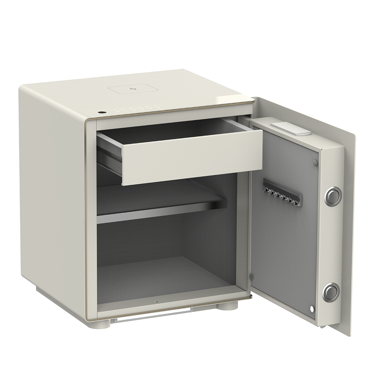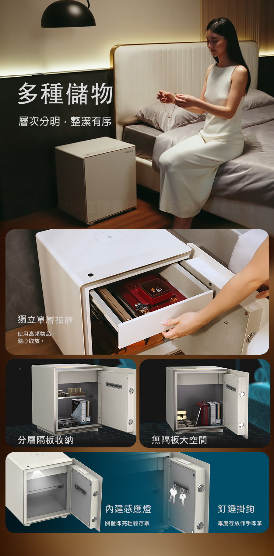 內建智能感應夜燈,柔和光線便於夜間使用;支援手機無線充電,打造安全、時尚、便利的收納新體驗。